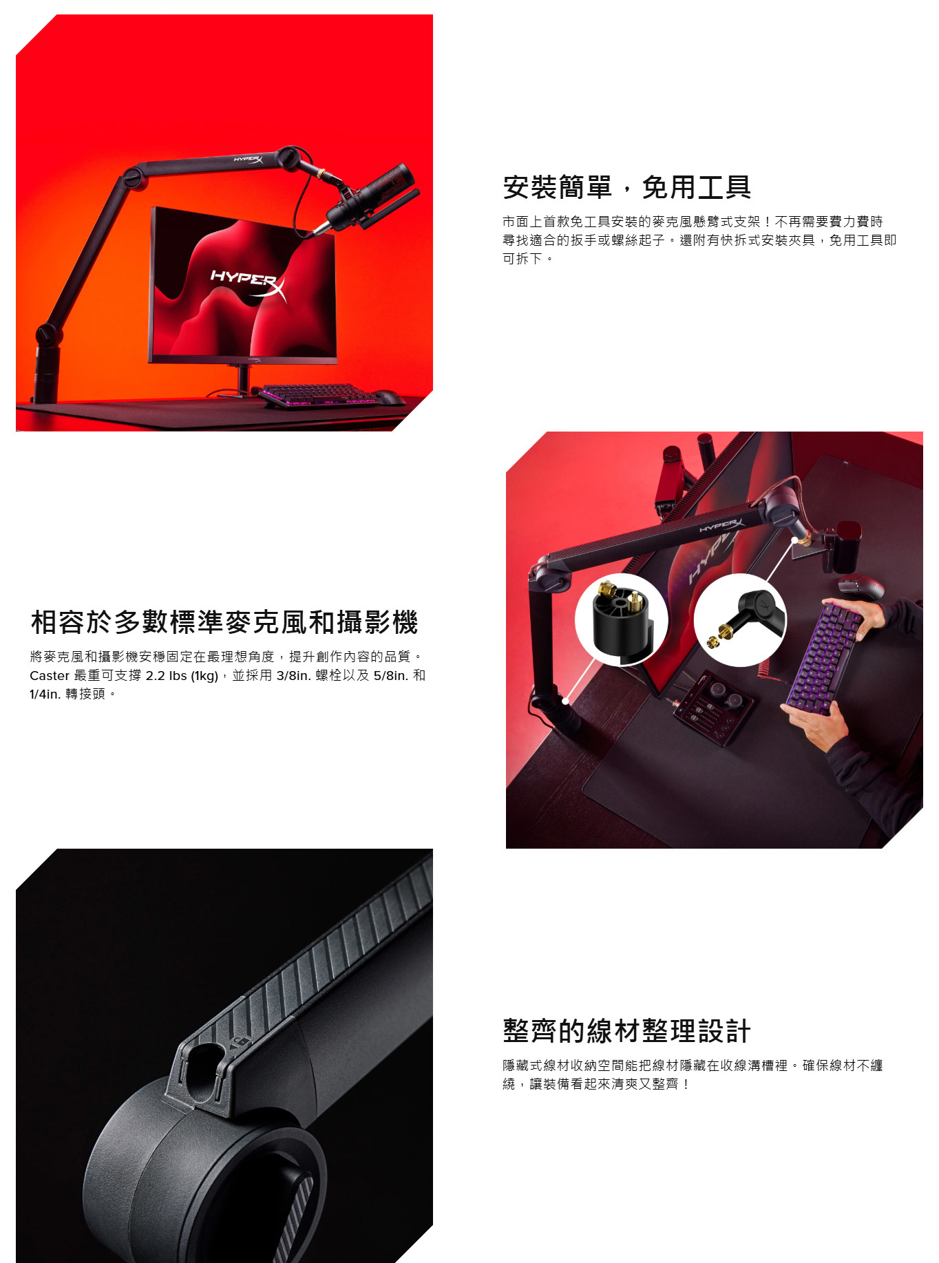 HyperX Caster 麥克風和攝影機懸臂式支架是實況主和內容創作者的絕佳配備。完全免工具安裝、簡易的設置步驟,不必再煩惱找不到適合的螺絲起子或扳手,隨時可以進行微調。支架內部具有彈簧輔助機構,能順暢滑動,讓您任意將麥克風或攝影機固定於想要的位置。HyperX Caster 不僅可固定設備,便利的隱藏式線材收納空間也能隱藏線材,維持整齊的外觀。