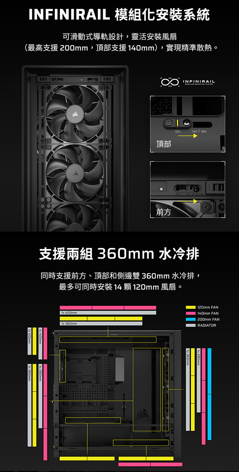 | 支援水冷: | 頂部:240mm / 280mm / 360mm / 420mm 前面:240mm / 280mm / 360mm 側面:240mm / 280mm / 360mm 後方:120mm / 140mm |