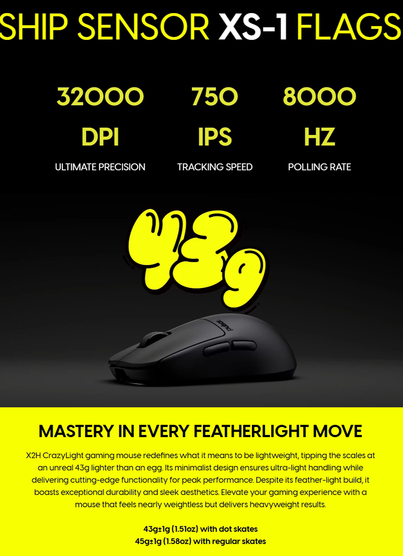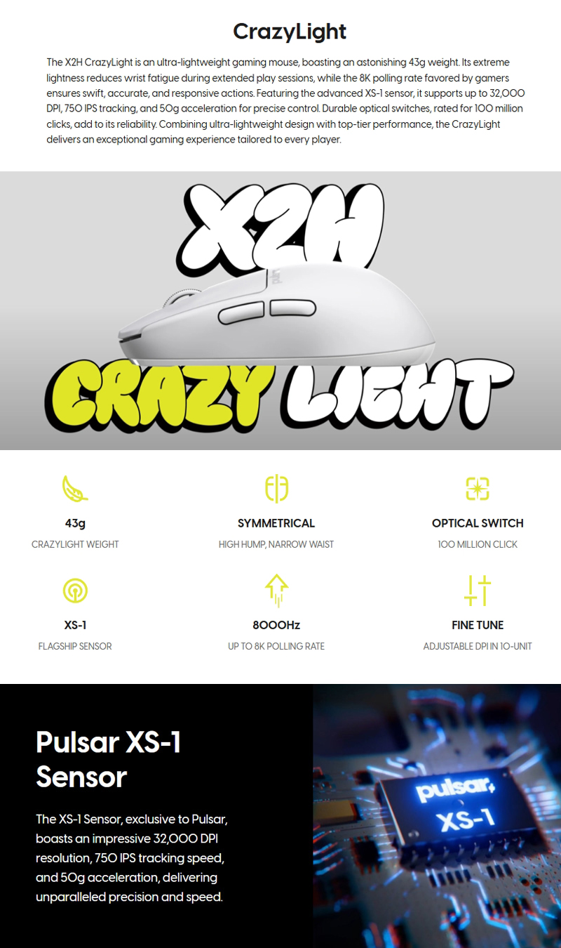 X2H CrazyLight 是一款超輕量遊戲滑鼠,重量僅為驚人的 43 克。其極致輕盈的設計可有效減輕長時間遊戲時的手腕疲勞,而備受遊戲玩家青睞的 8K 輪詢率則確保了快速、精準、靈敏的操作。它配備先進的 XS-1 感測器,支援高達 32,000 DPI、750 IPS 追蹤和 50g 加速度,帶來精準操控。耐用的光學微動開關,額定點擊次數達 1 億次,進一步提升了其可靠性。 CrazyLight 將超輕量設計與頂級性能相結合,為每位玩家量身定制非凡的遊戲體驗。