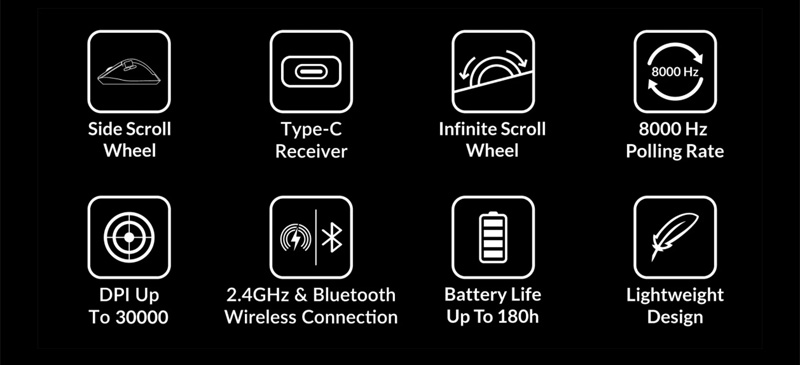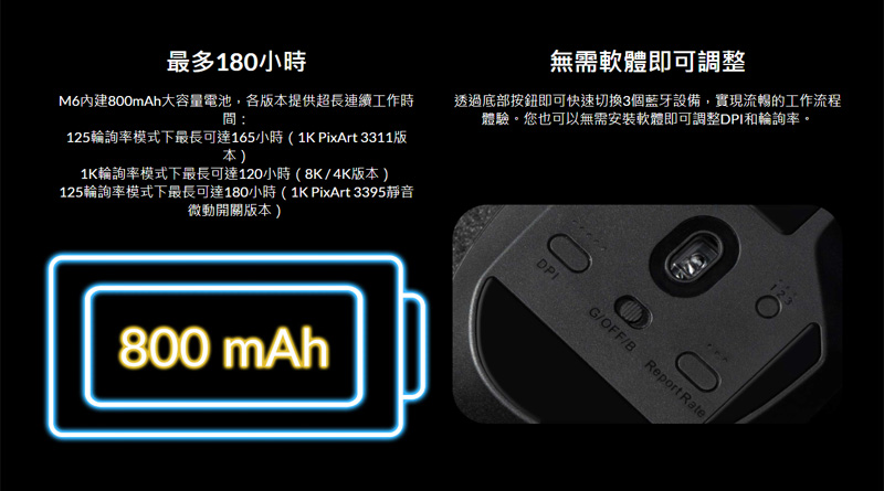 | 工作時間: | 125輪詢率模式下最長可達165小時(1K PixArt 3311版本) 1K輪詢率模式下最長可達120小時(8K / 4K版本) 125輪詢率模式下最長可達180小時(1K PixArt 3395靜音微動開關版本) |