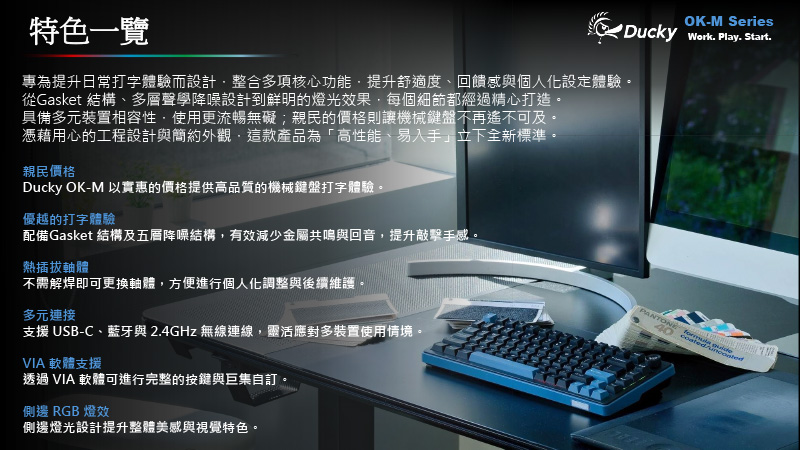 OK-M 是一款兼具可靠度、靈活性與美感的鍵盤,無論是專業人士、學生,或日常使用者,都能完美駕馭。