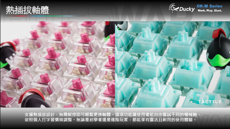 熱插拔軸座讓你能輕鬆調整鍵軸手感,打造專屬於你的輸入體驗。
