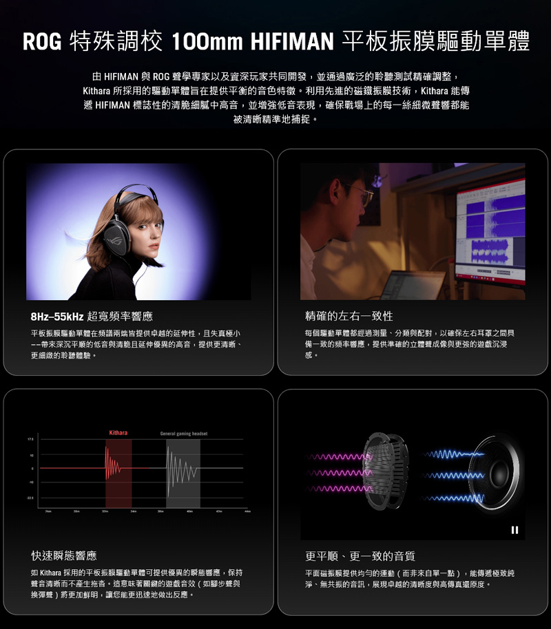 4、ROG 特殊調校 100mm HIFIMAN 平板振膜驅動單體:具備 8Hz–55kHz 超寬頻率響應,提供發燒級的高傳真音質、生動的細節以及極低的失真。