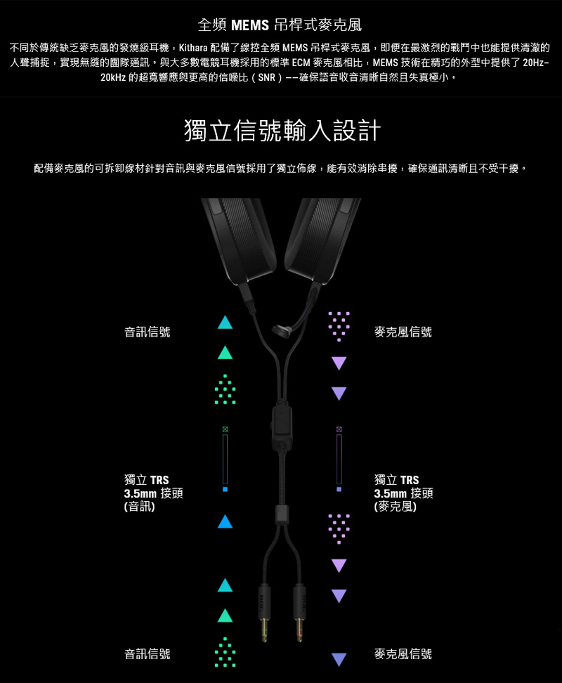 5、線控全頻 MEMS 吊桿式麥克風:具備 20Hz–20kHz 寬廣響應與高信噪比 (SNR),可精確收音並確保語音清晰;雙 3.5mm 輸入設計可防止串擾,確保溝通不中斷。