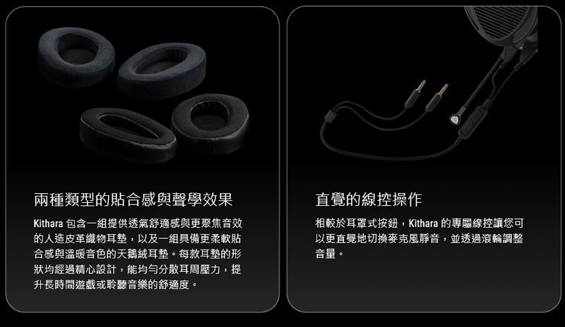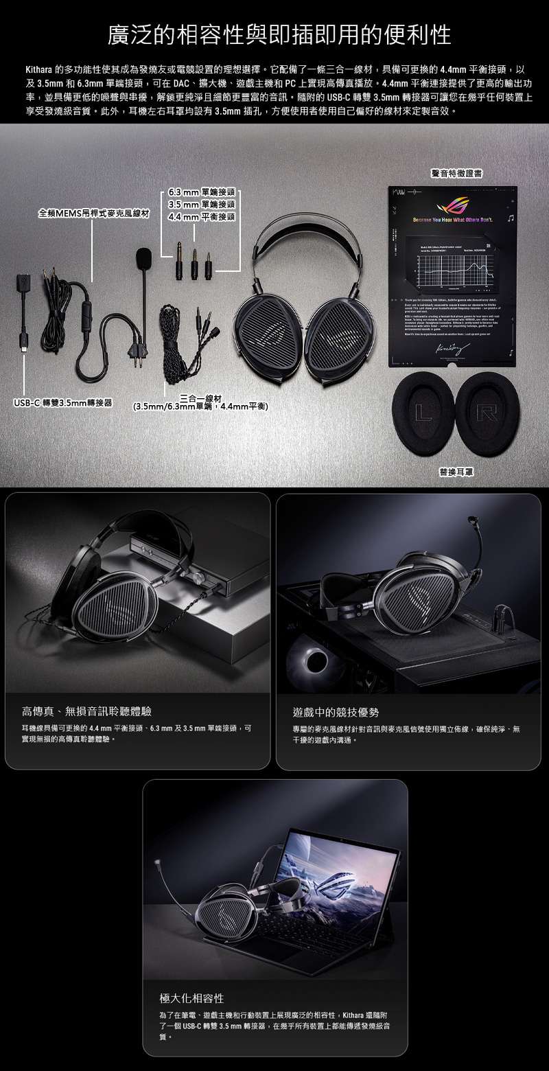 ROG Kithara 專為追求真高傳真、發燒級音質的玩家打造,搭載 HIFIMAN 領先的聲學技術。其開放式聲學設計與 ROG 特殊調校 HIFIMAN 100mm 平板振膜驅動單體,能傳遞栩栩如生且精確清亮的音訊細節。針對競爭激烈的遊戲環境,Kithara 配備了線控全頻 MEMS 麥克風,確保清晰的遊戲通訊。具備可更換接頭的平衡耳機線,結合隨附的 USB-C® 轉接器,確保了絕不妥協的音訊保真度,並廣泛相容於各種裝置。