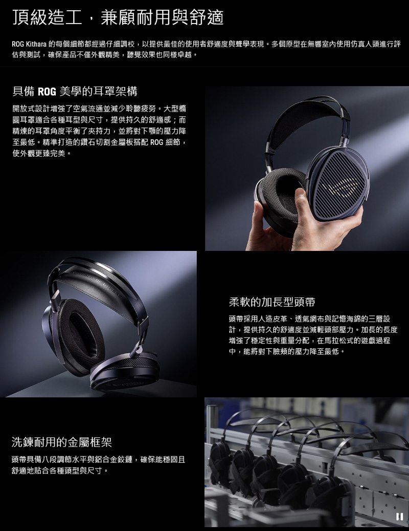 2、耐用且舒適的頂級造工:配備柔軟的可調式頭帶、堅固的金屬框架與鉸鏈,以及帶有經典 ROG 元素的時尚耳罩。