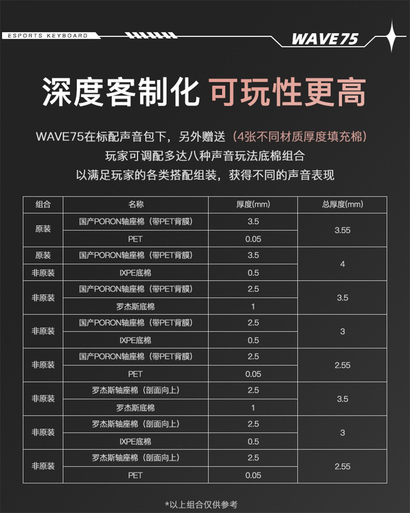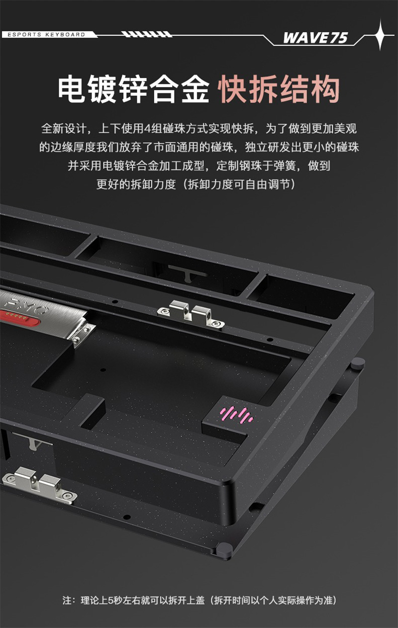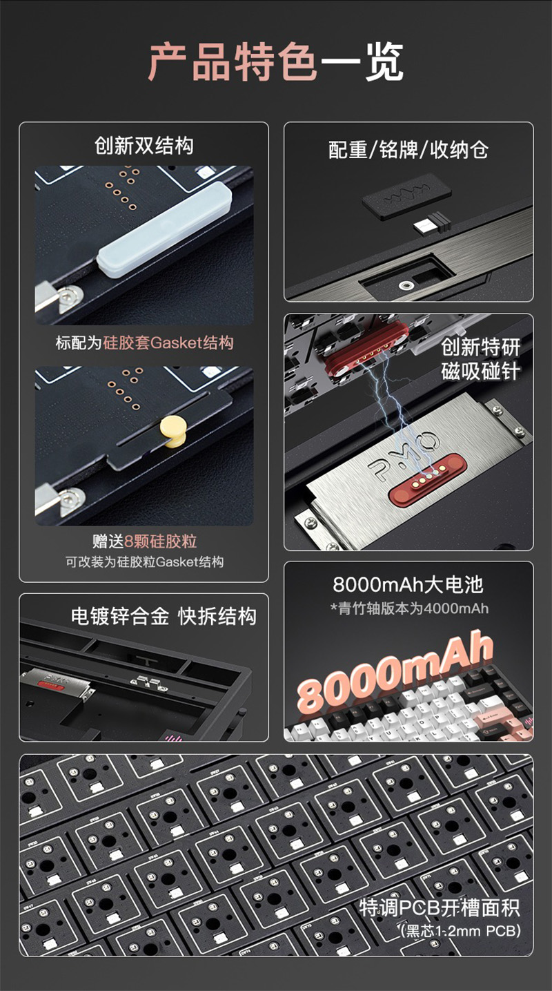 | 顏色 | 表面工藝 | 配重塊 | 燈效 | 電池容量 | 定位板 | 搭配軸體 |