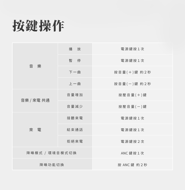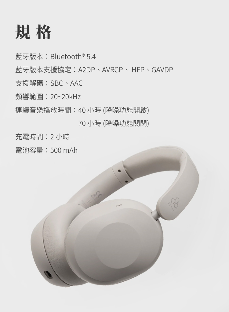 | 工作時間: | 連續音樂播放時間:40小時([降噪功能開啟)、70小時(降噪功能關閉) |