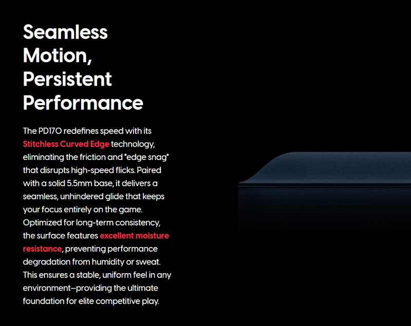 PD170 是一款高效能滑鼠墊,專為競技遊戲中的極致速度和穩定性而設計。它擁有堅固穩固的底座,有效防止滑鼠墊壓縮變形,從而實現更快、更流暢的滑動體驗。每個細節都經過精心設計,力求精準:圓潤的邊緣確保在激烈的遊戲過程中,手腕和滑鼠都能順暢移動,避免相互干擾。 PD170 為追求極致速度和穩定性的玩家提供了一個完美平整、可靠的參考點。
