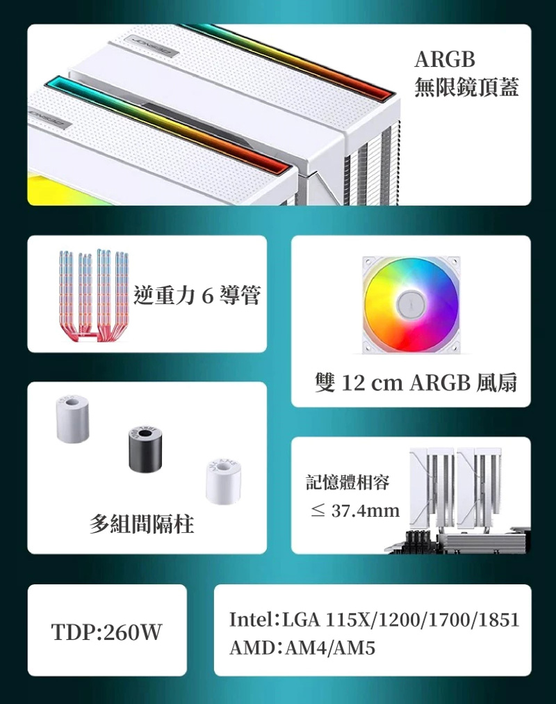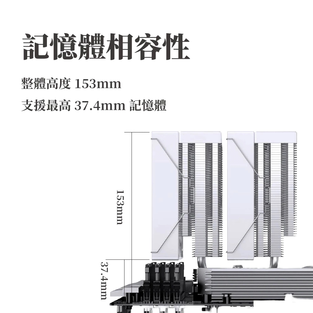 7、記憶體相容性,整體高度 153mm,支援最高 37.4mm 記憶體,可依記憶體高度與機殼寬度微調風扇位置(支援記憶體高度均含金手指在內)
