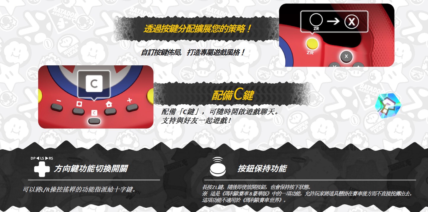 | 適用: | Nintendo Switch、Nintendo Switch 2、Nintendo Switch OLED ※ 不支援Lite PC 相容作業系統:Windows 10/11 需求:USB Type-A 連接埠 輸入方式:XInput ※本產品僅相容於 XInput 遊戲。不相容 DirectInput 遊戲。 |