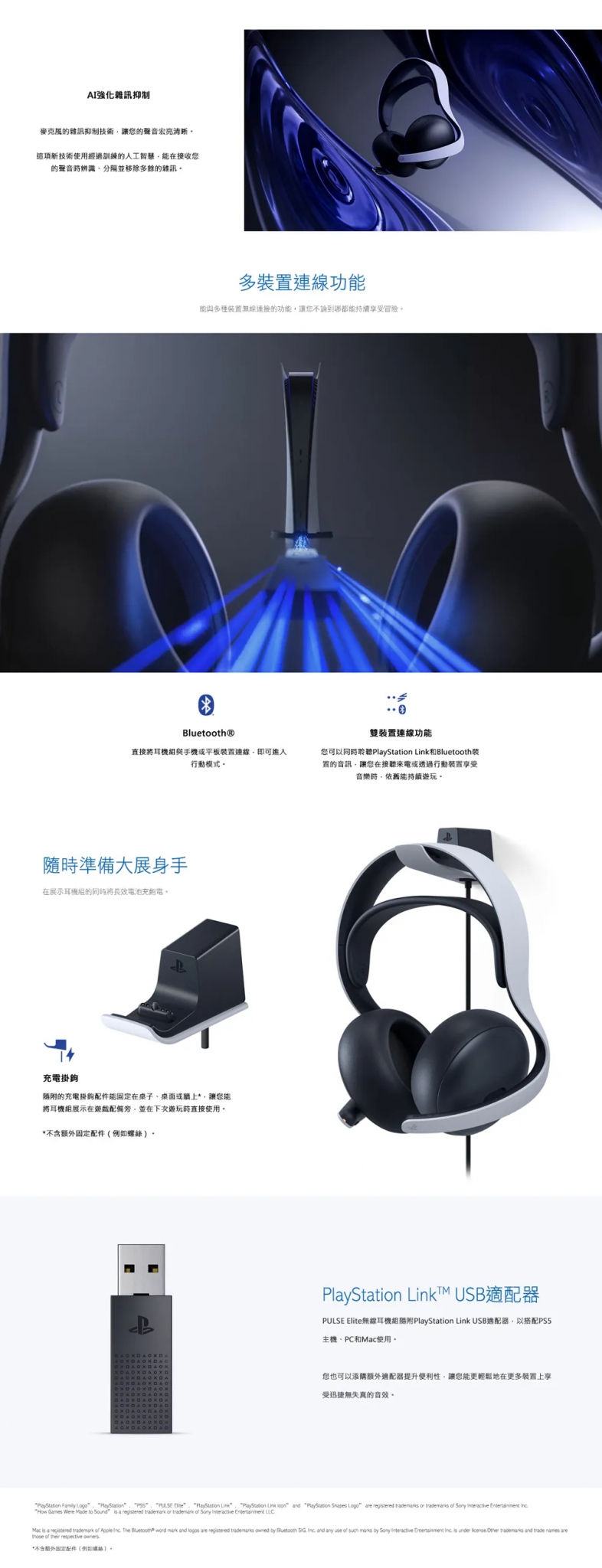 | 包裝內容物: | PlayStation PULSE Elite 無線耳機組 PlayStation便攜收納包 PlayStation Link USB 轉換器 充電掛鉤 |