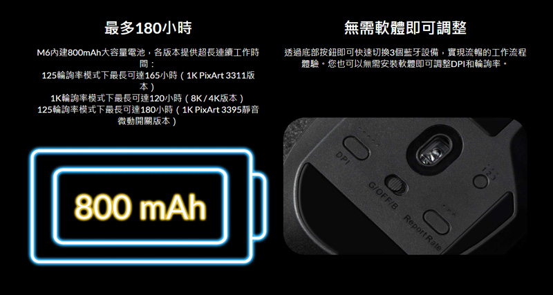 | 工作時間: | 125Hz模式下最長可達165小時(1K PixArt 3311版本) |