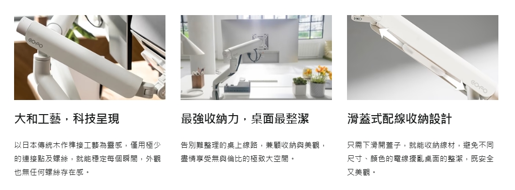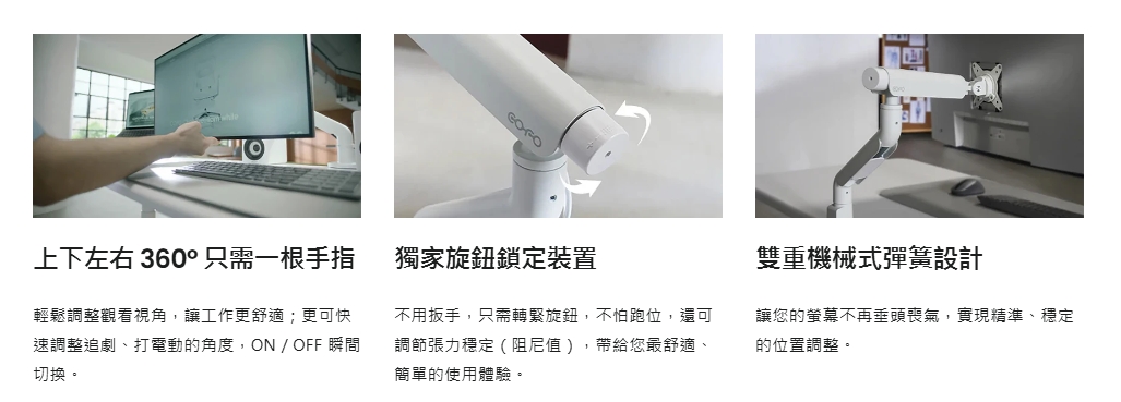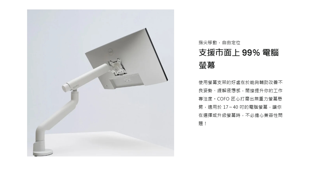 COFO 無重力螢幕懸臂,從材質、調整角度到線材收納等細節,皆以「為使用者帶來便利」的出發點設計。只要用一根手指輕推,螢幕就能穩定到位,讓日常工作更直覺、有效率!