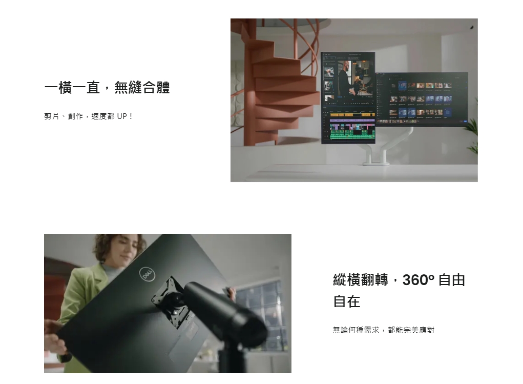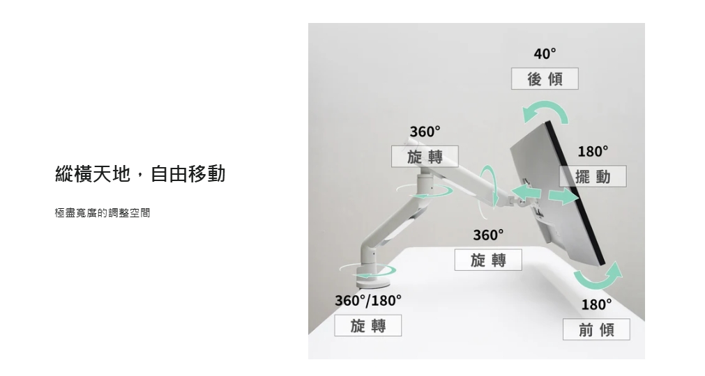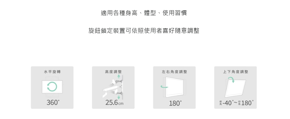 4、靈活調整,滿足各種視角需求:上、下、左、右各種角度皆具備極高的靈活度,讓不同使用者都能快速找到符合人體工學的角度。