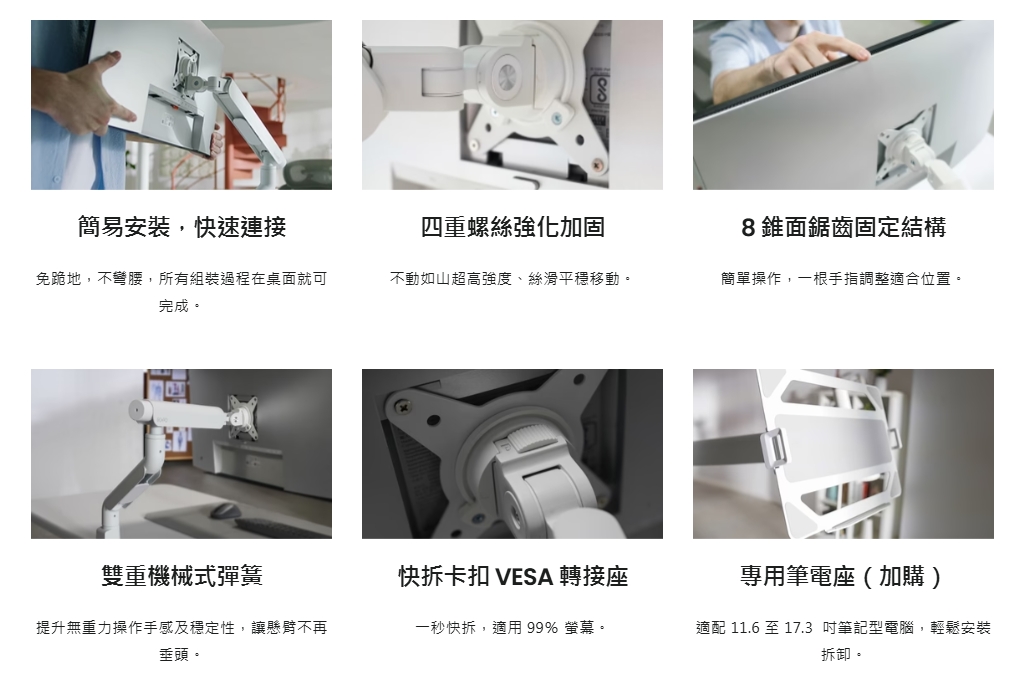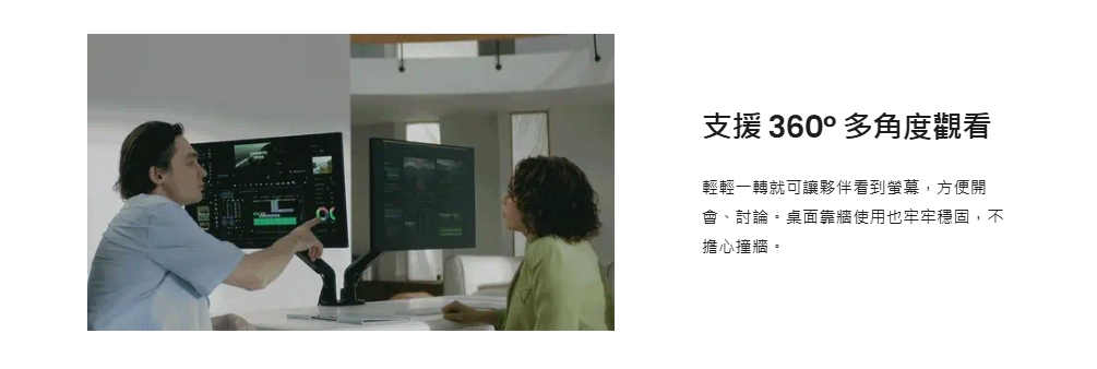 3、雙臂/單臂自由選擇:使用者可根據需求選擇 Pro(單臂)、Duo(雙臂)螢幕支架,滿足不同辦公需求。