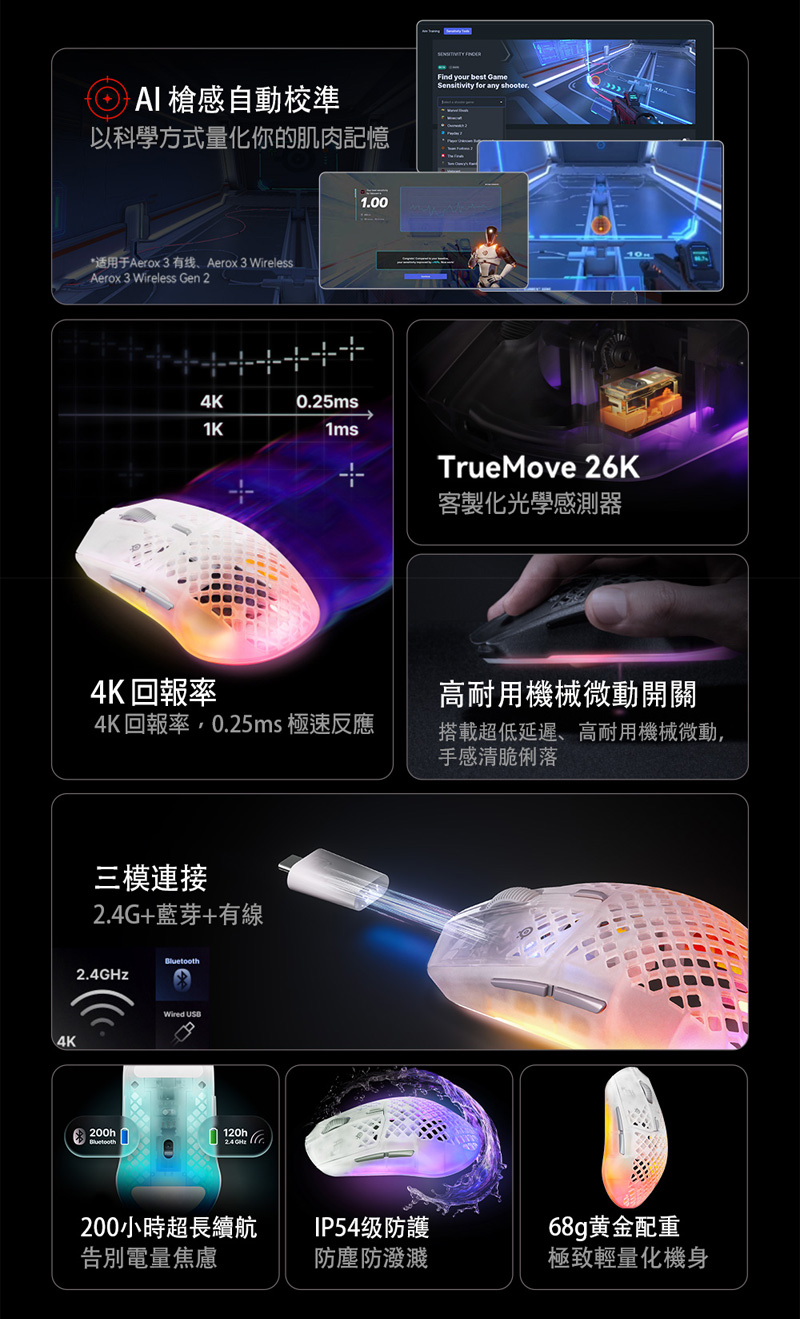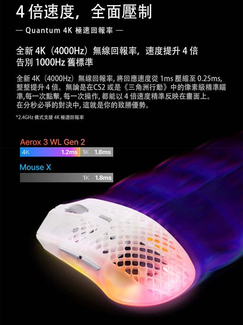 3、4K FAST,4K 無線輪詢技術提供前代產品的 4 倍速度(0.25 毫秒 vs 1 毫秒),搭配超快點擊反應,助您精準擊中頭部