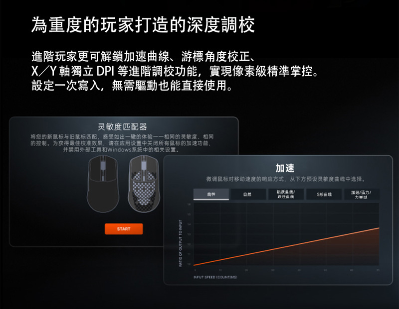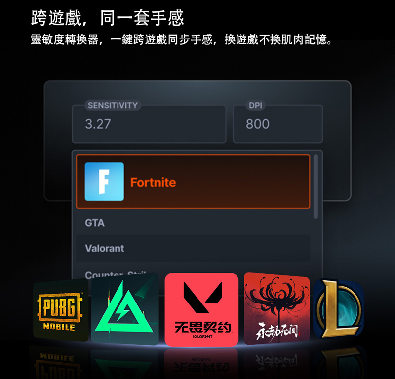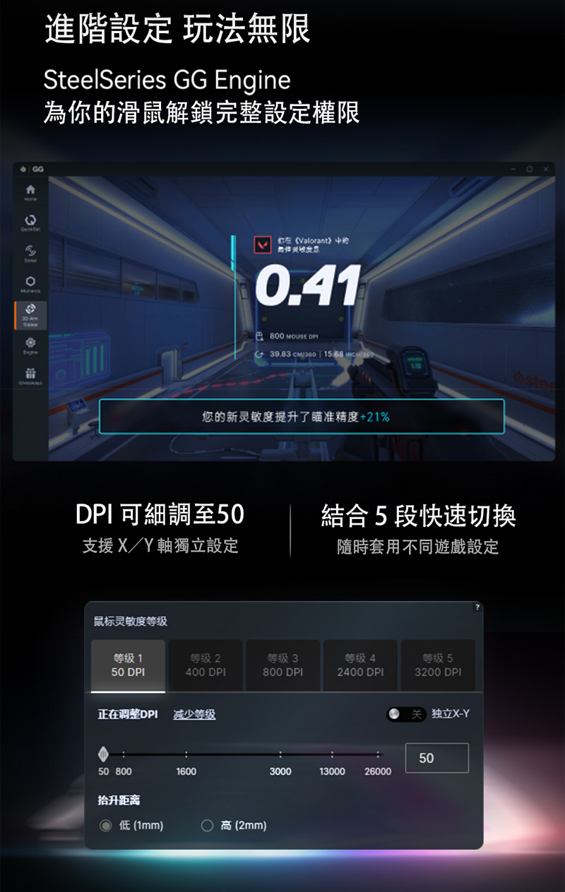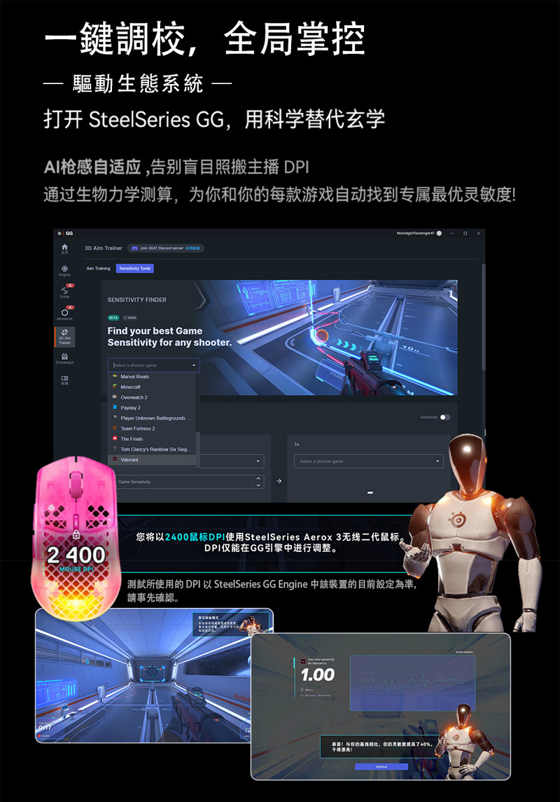 2、個人瞄準工具,靈敏度調整器可透過簡易的遊戲專用轉換功能提升瞄準精準度,搭配 3D 瞄準訓練軟體,助您精進技巧