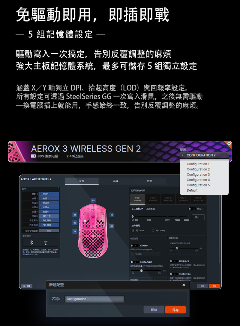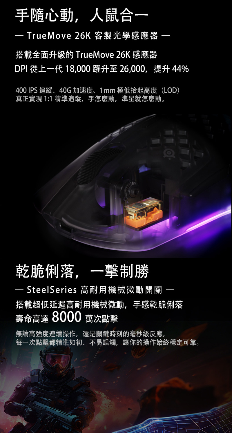 1、TRUEMOVE 26K 感測器,具備 26,000 DPI 精準度、400 IPS 速度及 40G 加速度,實現超快滑動、流暢追蹤與零跳動