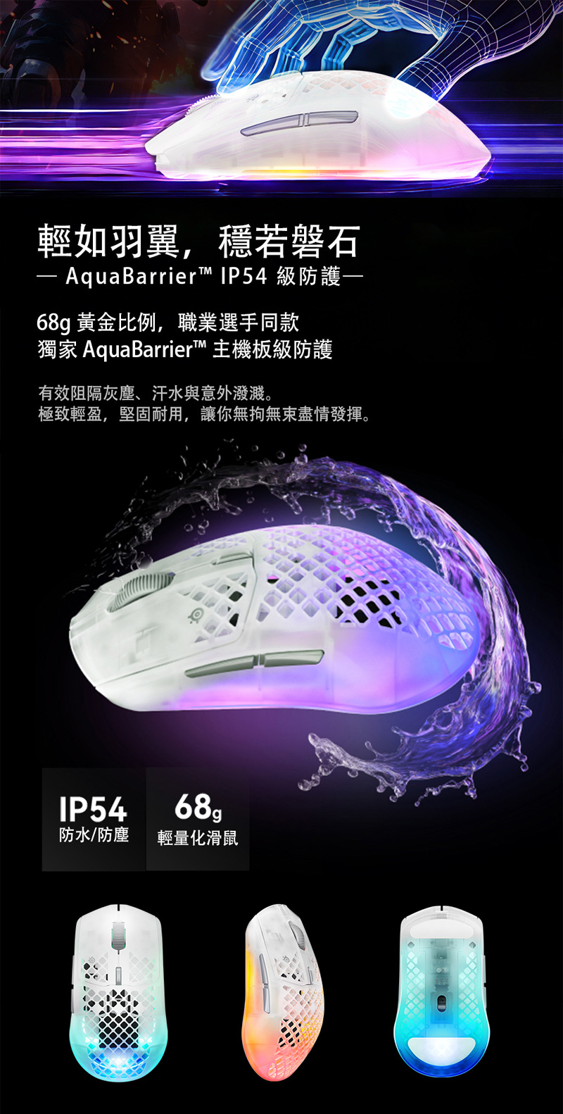 5、超輕量、防水設計,採用 AQUABARRIER™ 技術,具備 IP54 防護等級,有效防止水花、灰塵及污垢侵入滑鼠內部,重量僅 68 公克