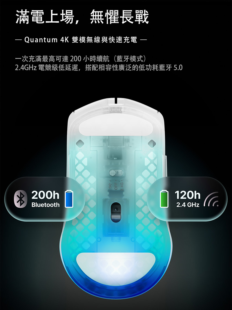 4、量子 4K 無線技術,無縫切換超高速 2.4GHz 電競無線與藍牙 5.0,為競技對戰提供低延遲表現,並能輕鬆連接多台裝置
