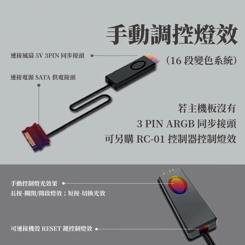(若主機板沒有 3 PIN ARGB 同步接頭,可另購RC-01控制器控制燈效)