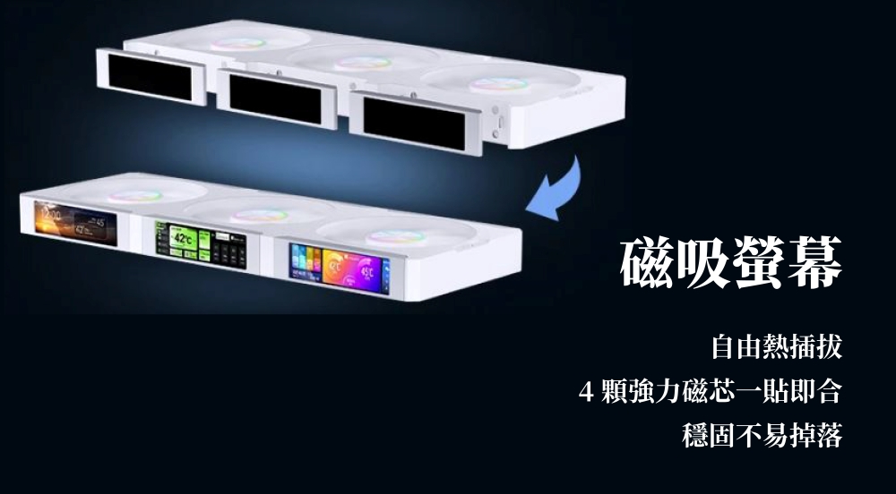 2、磁吸螢幕,自由熱插拔,4 顆強力磁芯一貼即合,穩固不易掉落