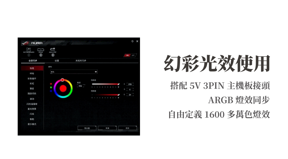 6、幻彩光效使用攻略,搭配 5V 3PIN 主機板接頭,ARGB 燈效同步,自由定義 1600 多萬色燈效