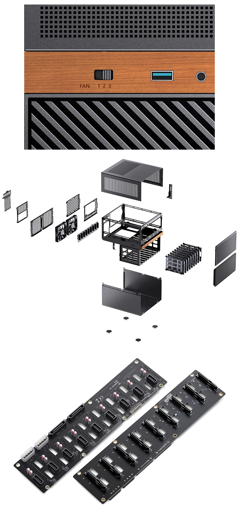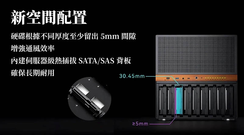 8、硬碟根據不同厚度至少留出 5mm 間隙,增強通風效率,內建伺服器級熱插拔SATA/SAS背板,確保長期耐用