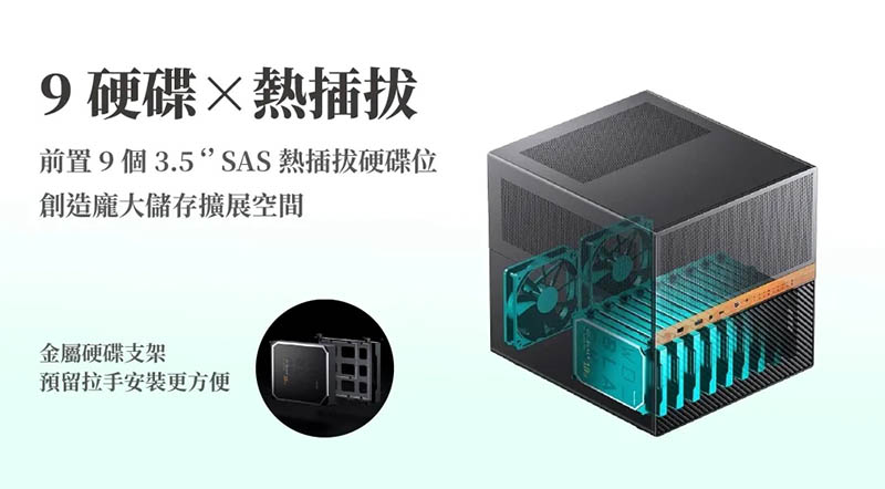 7、前置 9 個 3.5‘’SAS 熱插拔硬碟位,創造龐大儲存擴展空間,金屬硬碟支架,預留拉手安裝更方便