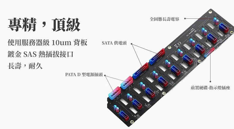 3、使用服務器級 10um 背板,鍍金 SAS 熱插拔接口,長壽,耐久