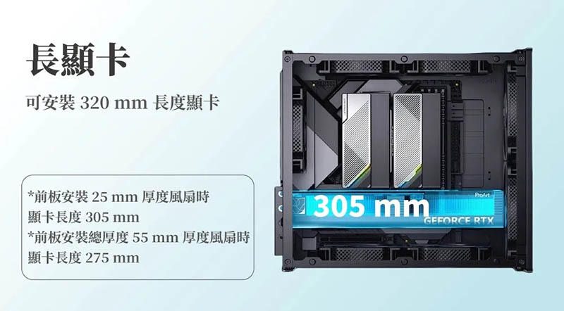 9、長顯卡,可安裝 320 mm 長度顯卡(前板安裝 25 mm 厚度風扇時,顯卡長度 305 mm;前板安裝總厚度 55 mm 厚度風扇時,顯卡長度 275 mm)