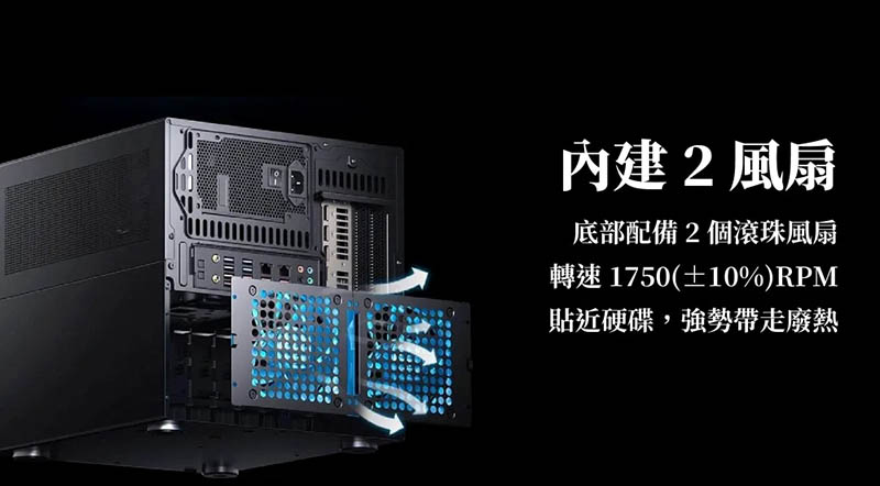 5、底部配備 2 個滾珠風扇,轉速 1750(±10%)RPM,貼近硬碟,強勢帶走廢熱