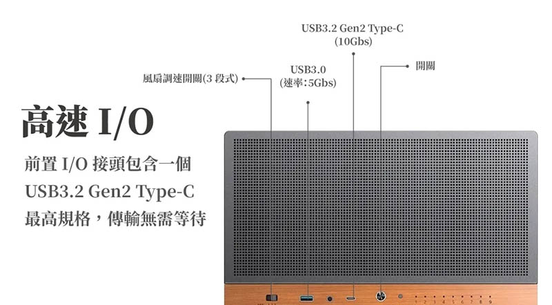 6、前置 I/O 接頭包含一個,USB3.2 Gen2 Type-C (10Gbps),最高規格,傳輸無需等待