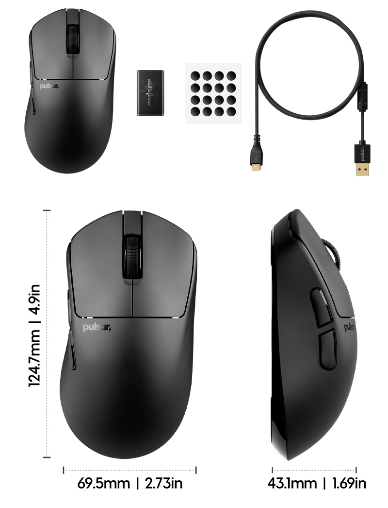 | 包裝內容: | X3 CrazyLight Wireless Mouse x 1 8K Dongle x 1 USB-C Cable x 1 Pulsar Dot Skate (16ea UHMW-PE 6.6mm ) x 1 |