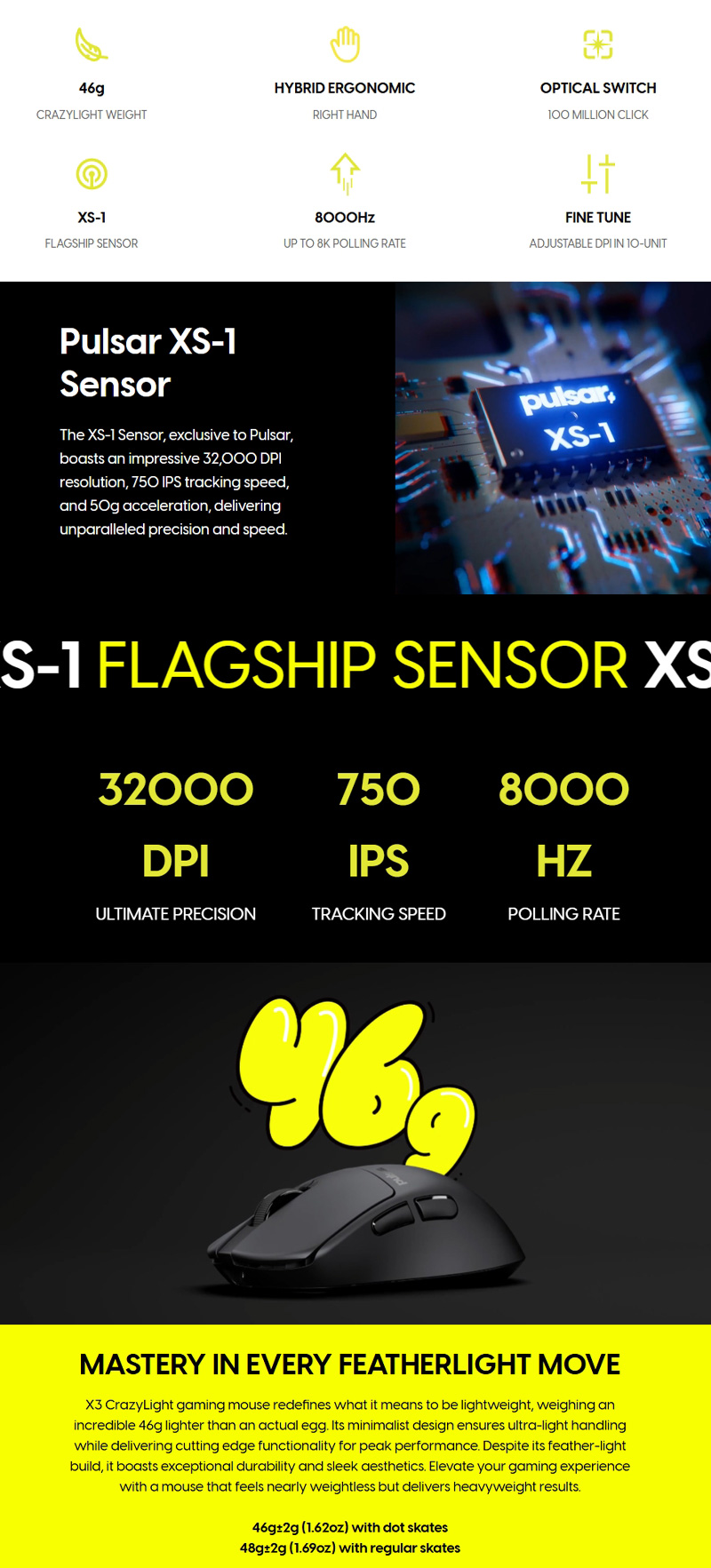 X3 CrazyLight 是一款超輕量遊戲滑鼠,重量僅為驚人的 46 克。採用獨特的混合人體工學設計,完美融合了對稱和非對稱造型。其極致輕盈的設計可有效減輕長時間遊戲時的手腕疲勞,而備受遊戲玩家青睞的 8K 輪詢率則確保了快速、精準、靈敏的操作。它配備先進的 XS-1 感測器,支援高達 32,000 DPI、750 IPS 追蹤和 50g 加速度,帶來精準操控。耐用的光學微動開關,額定點擊次數達 1 億次,進一步提升了其可靠性。 CrazyLight 將超輕量設計與頂級性能相結合,為每位玩家量身定制非凡的遊戲體驗。