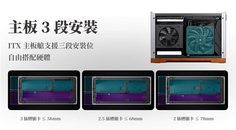 9、主板 3 段安裝,ITX 主板艙支援三段安裝位,自由搭配硬體,下壓式塔扇支援: