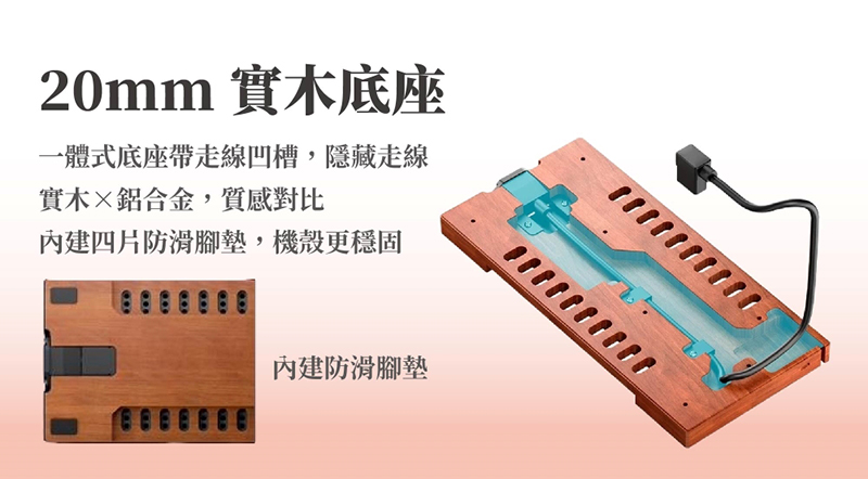 8、20mm實木底座,一體式底座帶走線凹槽,隱藏走線,實木×鋁合金,質感對比,內建四片防滑腳墊,機殼更穩固
