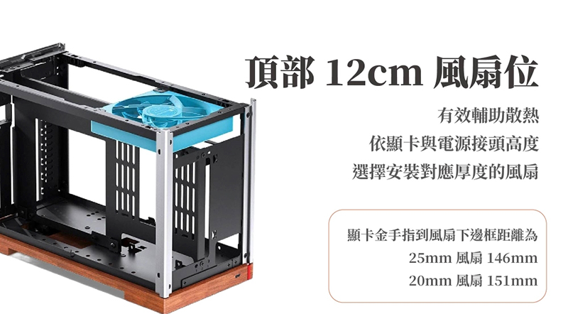 7、頂部 12cm 風扇位,顯卡金手指到風扇下邊框距離為,25mm 風扇 146mm;20mm 風扇 151mm