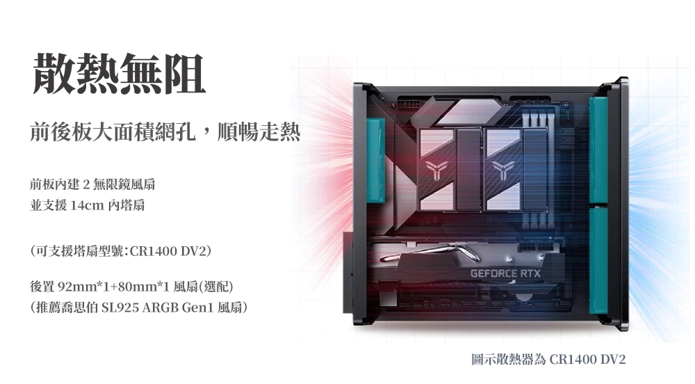 3、前板內建 2 無限鏡風扇,並支援 14cm 內塔扇
