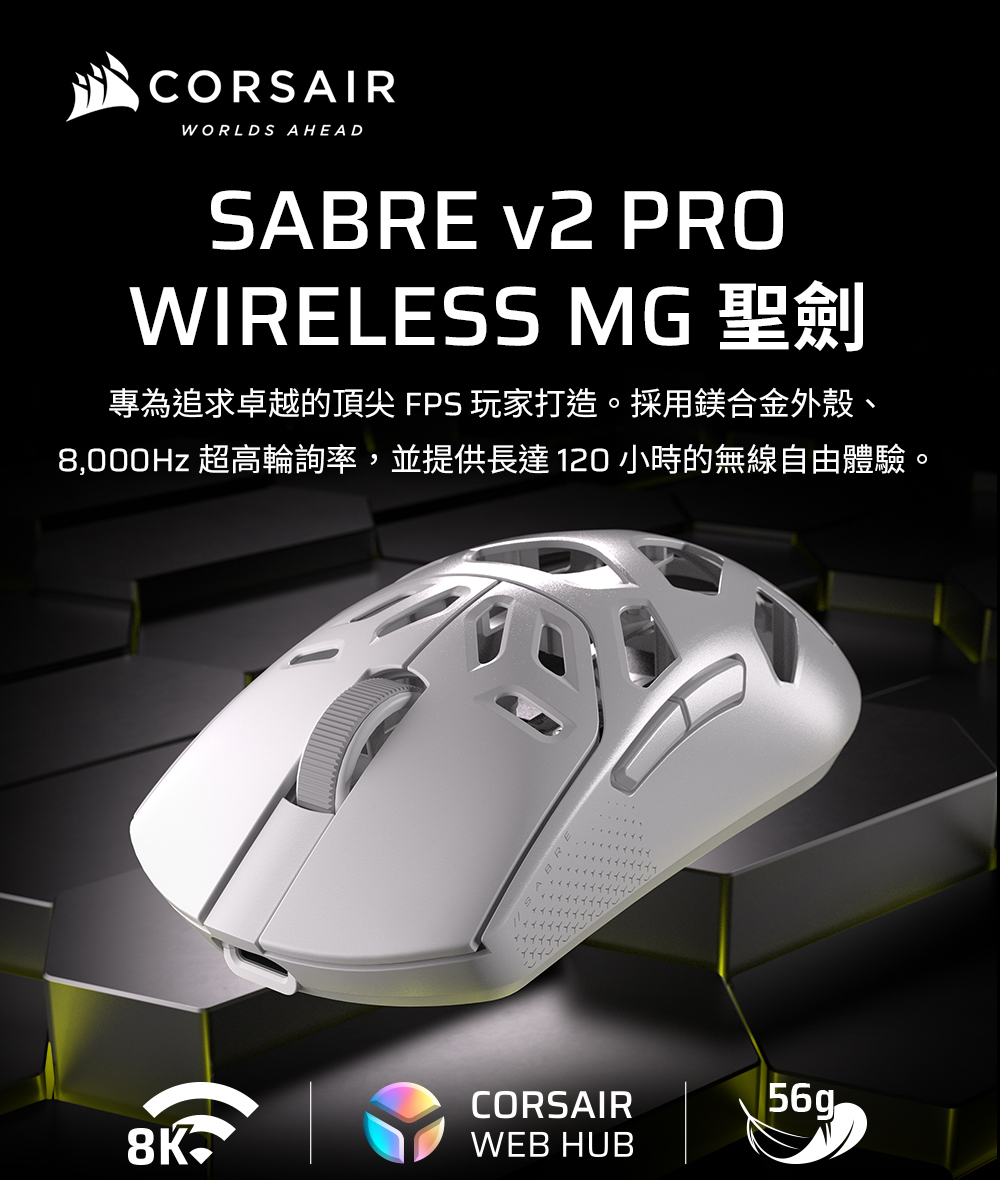 | 品名: | Corsair 海盜船 聖劍 SABRE V2 PRO MG 8K無線滑鼠 |