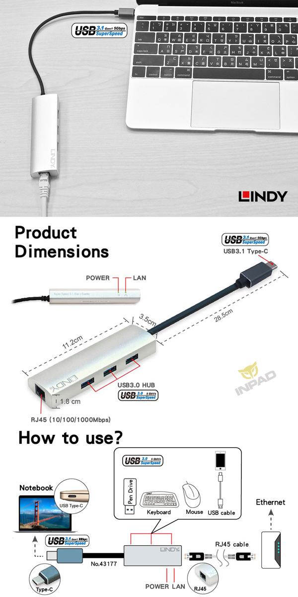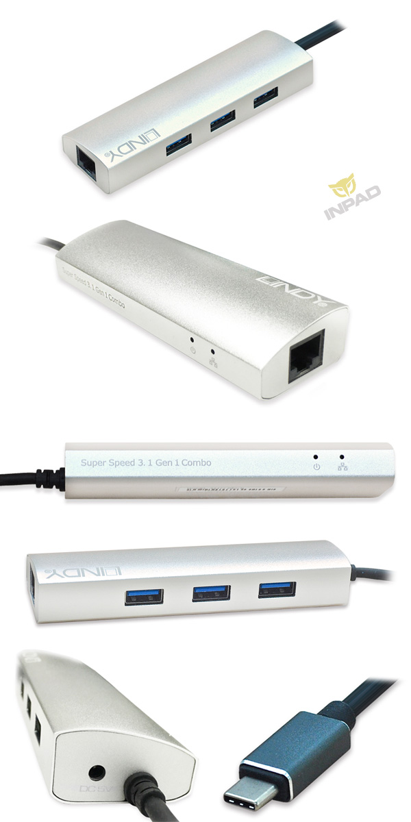 LINDY USB3.1 Gen1 Type-C to 有線千兆網路+3埠USB3.0集線器 【商品特色】 1、金屬材質,散熱性佳 2、無需外接電源即可使用 3、可擴充其他USB3.0設備 4、支援全雙工/半雙工流量控制 5、不需拆機殼就可搞定網路問題 6、相容於Thunderbolt 3 Type-C接口 7、簡單連接電腦、Mac、UltraBook,快速有線上網