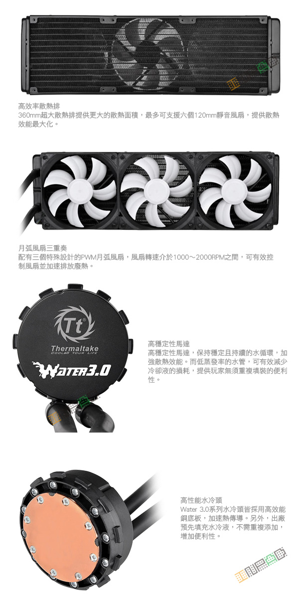 Thermaltake 曜越 Water 3.0 Ultimate 水冷散熱器 【商品介紹】 曜越為玩家全方位打造的 Water 3.0 Ultimate一體式水冷散熱器,擁有360mm超大散熱排及三個120mm靜音風扇,提供最佳冷卻效率。除了更完美的散熱效能和極致靜音的特點外,簡單又方便的安裝程序,提供您水冷散熱系統的最佳選擇。 【商品特色】 1、高性能水冷頭