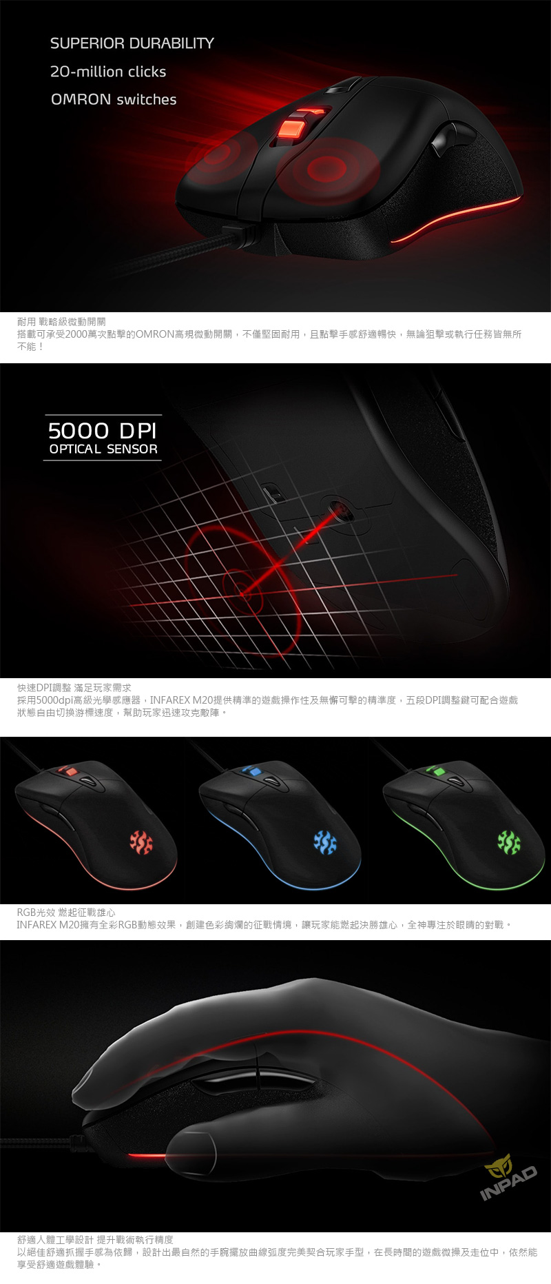 XPG 威剛 INFAREX M20光學滑鼠 【商品介紹】 M20電競滑鼠採用高品質OMRON微動開關,可承受2000萬次的點擊次數,堅固耐用;搭載5000dpi高級光學感應器,提供玩家優異的點擊精準度與操作性;全彩RGB光效能增強玩家作戰信念,讓您無後顧之憂,全力劍指王座! 耐用 戰略級微動開關 快速DPI調整 滿足玩家需求 RGB光效 燃起征戰雄心 舒適人體工學設計 提升戰術執行精度