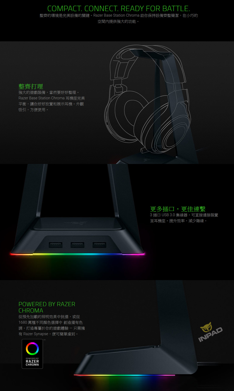 Razer 雷蛇 Base Station Chroma 耳機架 【商品介紹】 強大的遊戲裝備,當然要好好整理。Razer Base Station Chroma 耳機座完美平衡,讓你好好放置和展示耳機。外觀吸引,方便使用。 【商品特色】 1、防滑底座