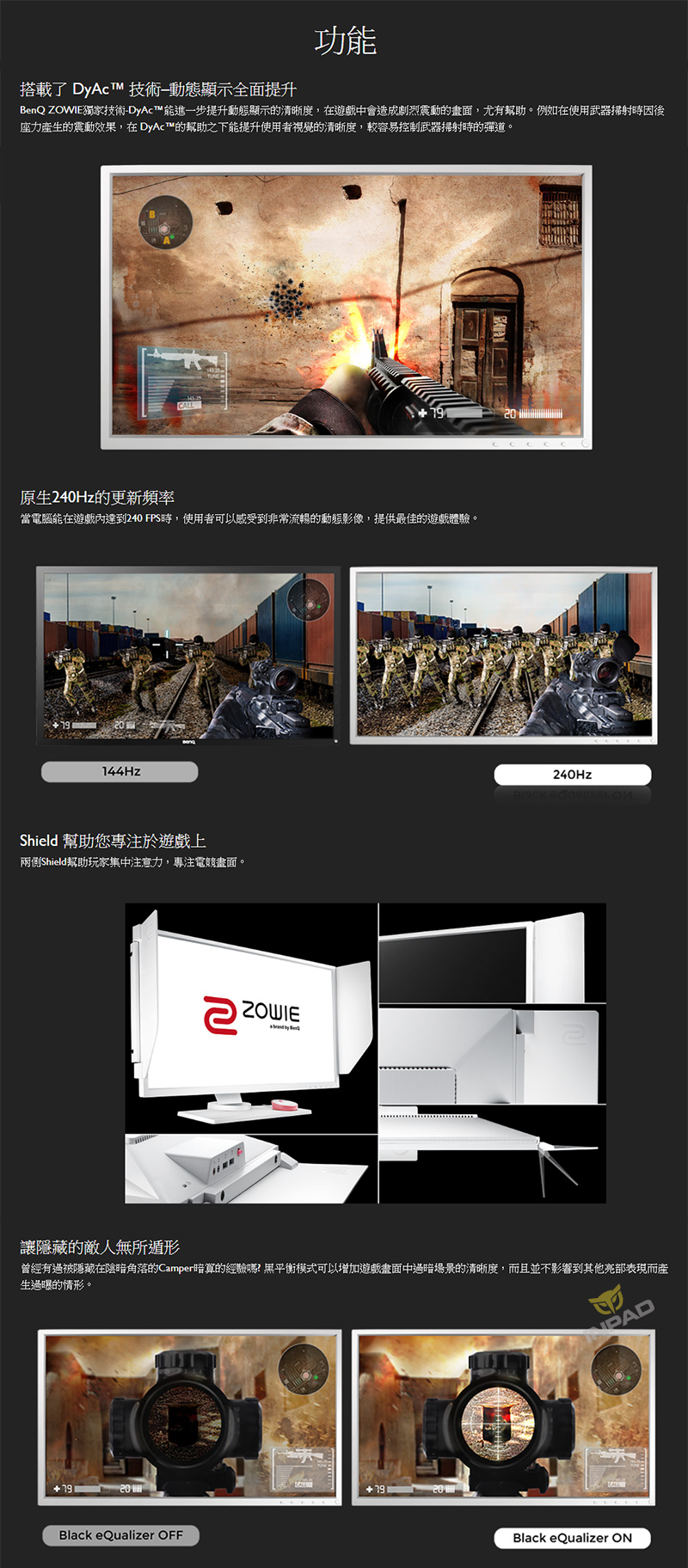 ZOWIE XL2546 DIVINA 24.5吋 電競專用液晶螢幕 【商品介紹】 XL2546與XL2540都具備原生240Hz的更新頻率,XL2546則搭載了DyAc™技術,進一步提升動態顯示的清晰度,在遊戲中會造成劇烈震動的畫面,尤有幫助。例如在使用武器掃射時因後座力產生的震動效果,在DyAc™的幫助之下能提升使用者視覺的清晰度,較容易控制武器掃射時的彈道。 【商品特色】 1、原生240Hz刷新率,提供最流暢的遊戲體驗