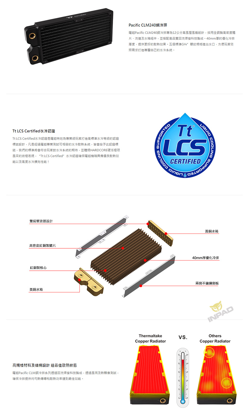 Thermaltake 曜越 Pacific CLM240 銅冷排 【商品特色】 1、高密度銅製鰭片設計