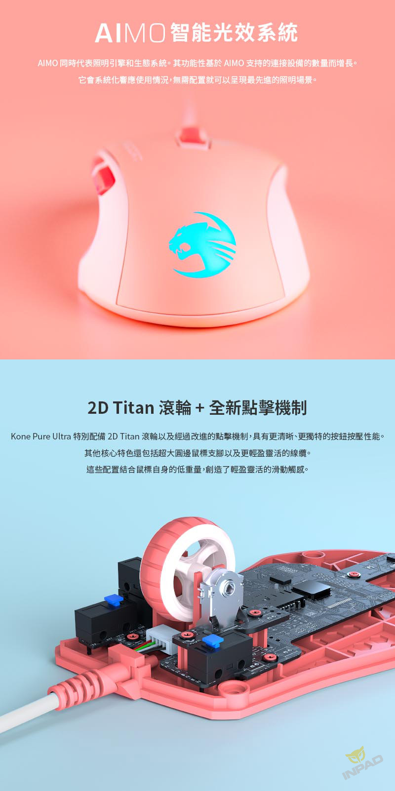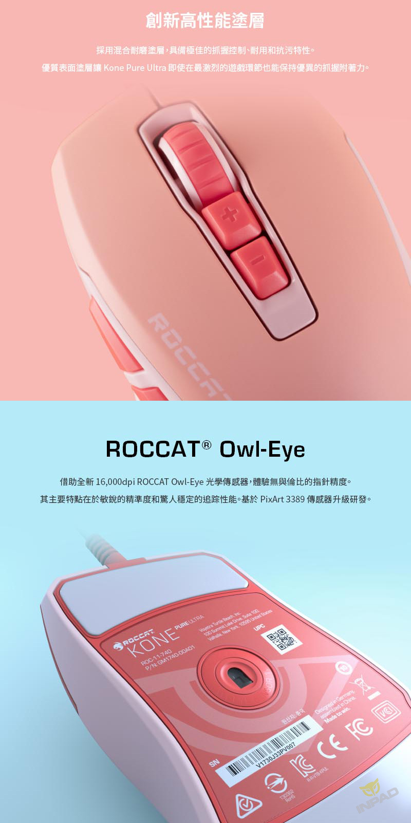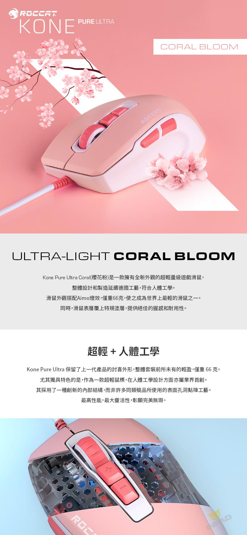 ROCCAT Kone Pure Ultra 魔幻豹 夜梟輕量版 櫻花粉 光學滑鼠