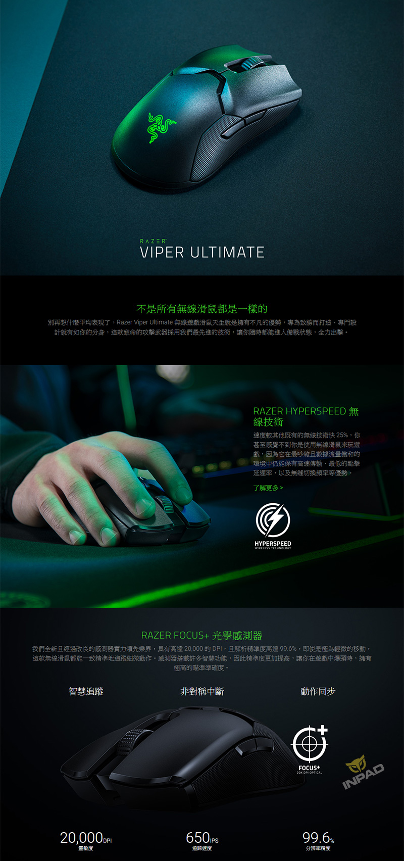 Razer 雷蛇 Viper Ultimate毒蝰終極版無線光學滑鼠(無充電座) ※此賣場版本無附充電座 【商品介紹】 Razer Viper Ultimate 無線遊戲滑鼠天生就是擁有不凡的優勢,專為致勝而打造。專門設計就有如你的分身,這款致命的攻擊武器採用我們最先進的技術,讓你隨時都能進入備戰狀態,全力出擊。 【商品特色】 1、74公克輕量設計