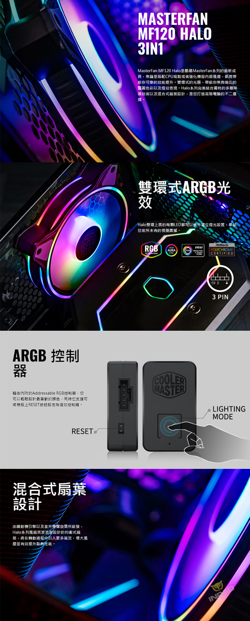 | 品名: | CoolerMaster MasterFan MF120 HALO 3合1 12公分風扇 |
